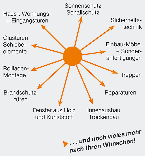 Vom individuellen Möbelbau bis zur Fertigung von Treppen, Türen, Decken, Wandverkleidungen, Einbau von Fenstern, Rollladenmontage, Fußböden, Sicherheitstechnik usw. alle Facetten einer modernen Tischlerei.